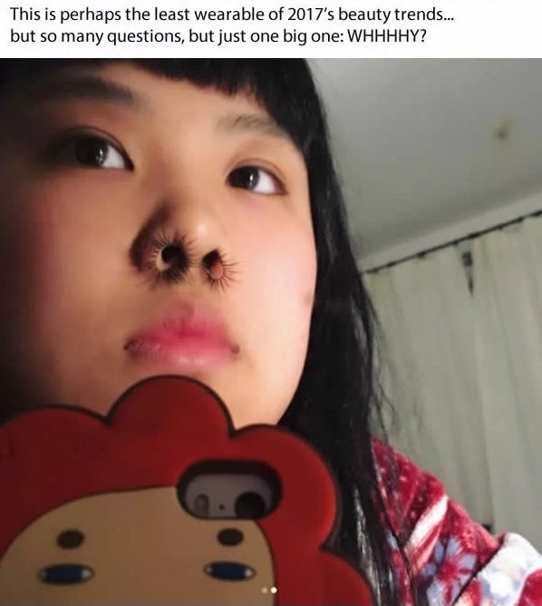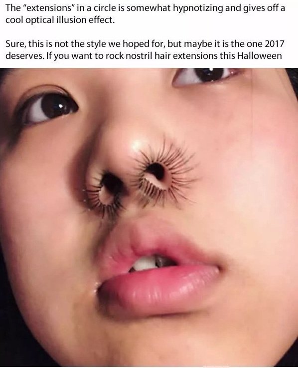 2017 is also the year where we were reminded that fashion can take a horrible turn when we start using extension hairs in the wrong places. The girls decided to use them for their nose hairs and around the nostrils which were supposed to create an optical illusion. Unfortunately, a lot of people were not going to buy that.