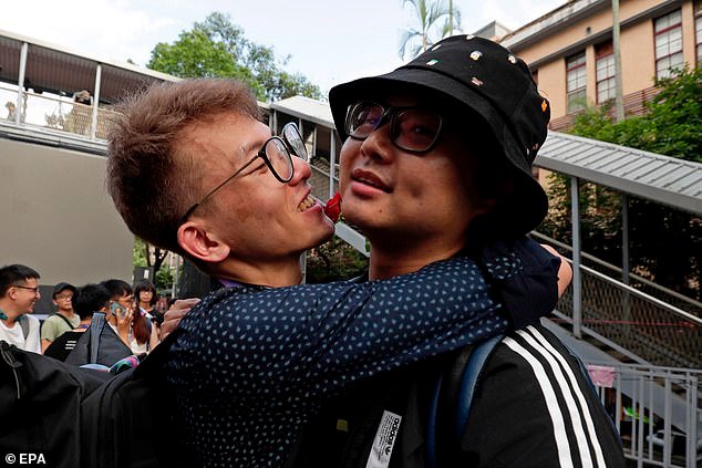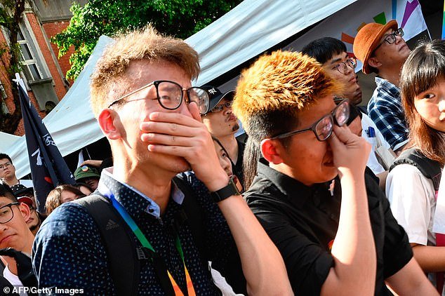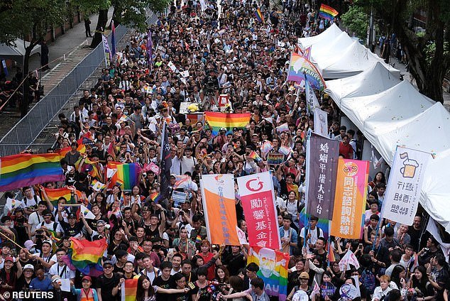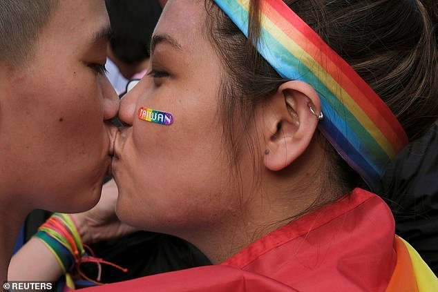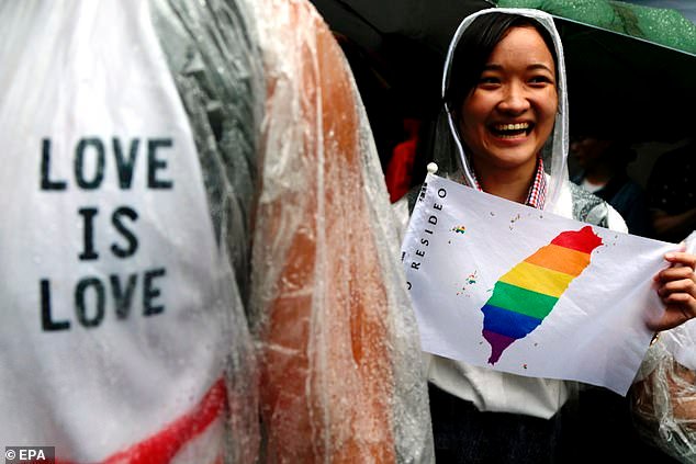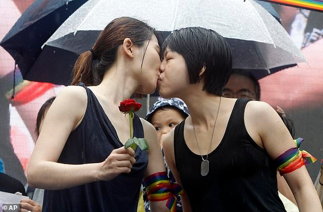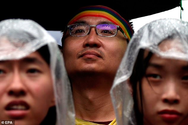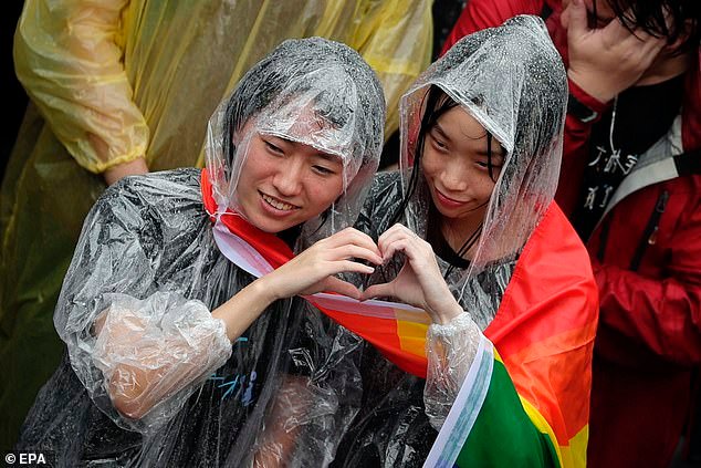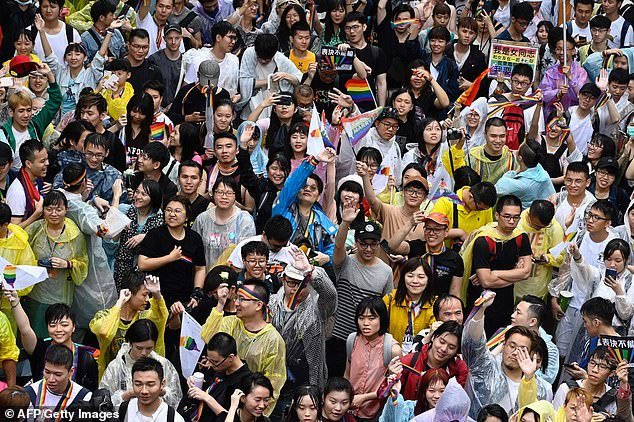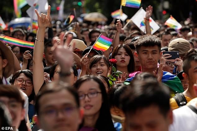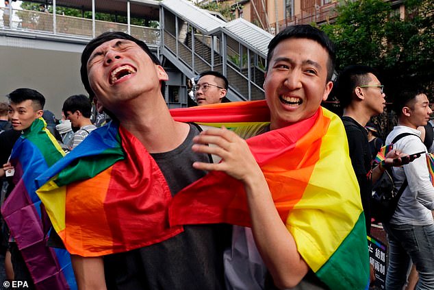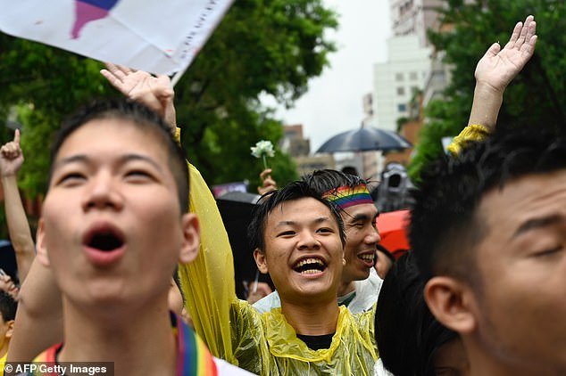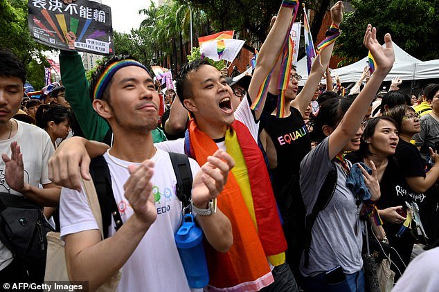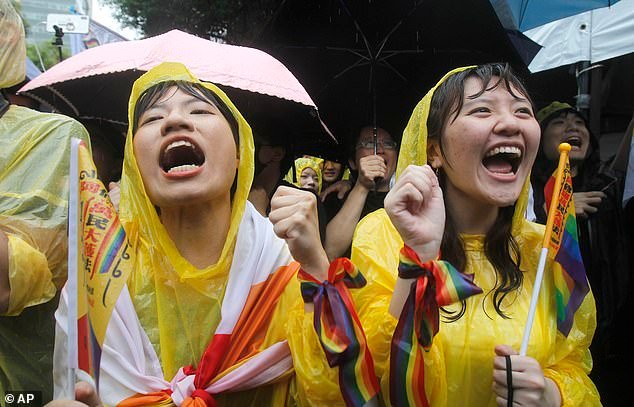 Taiwan also held a referendum rejecting homosexuality being taught in schools, shocking many young residents (pictured, rights campaigners celebrate)