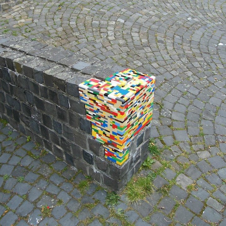 A crumbling old cobblestone wall restored with Legos
