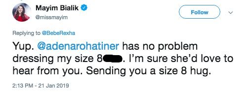 But hey, she's not alone in this! Actress Mayim Balik commented on her situation, showing support and shout out for a designer who had no problem dressing her. Plus, she sent a size 8 hug. How cute is that!
