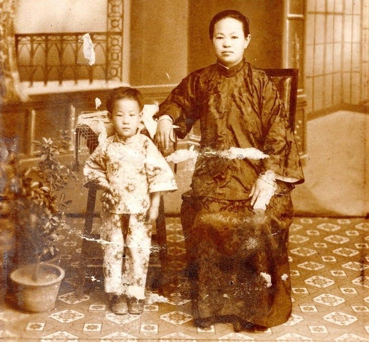 6. “My grandmother and great-grandmother in the late 1920s in China. Since she was the only child, they kept her hair short like a boy, so that she would be respected as the future head of the household. She also told me she refused to take this picture until they bribed her with grapes.”