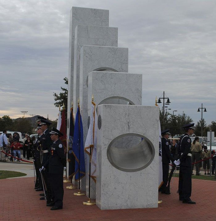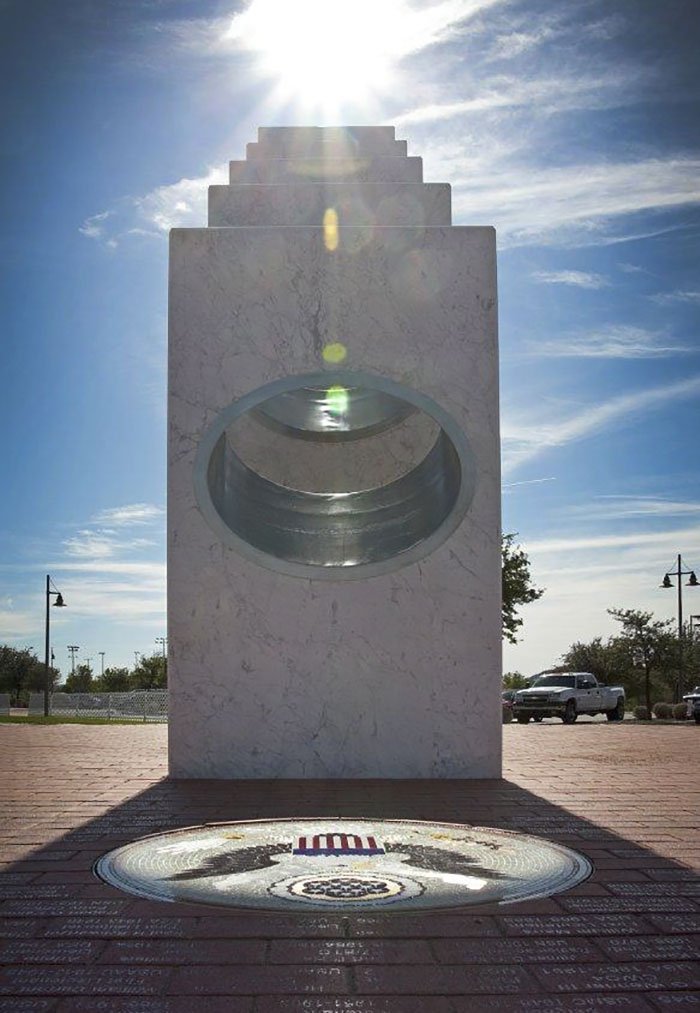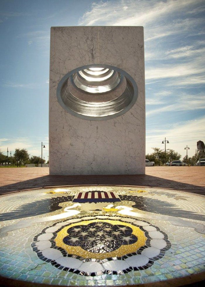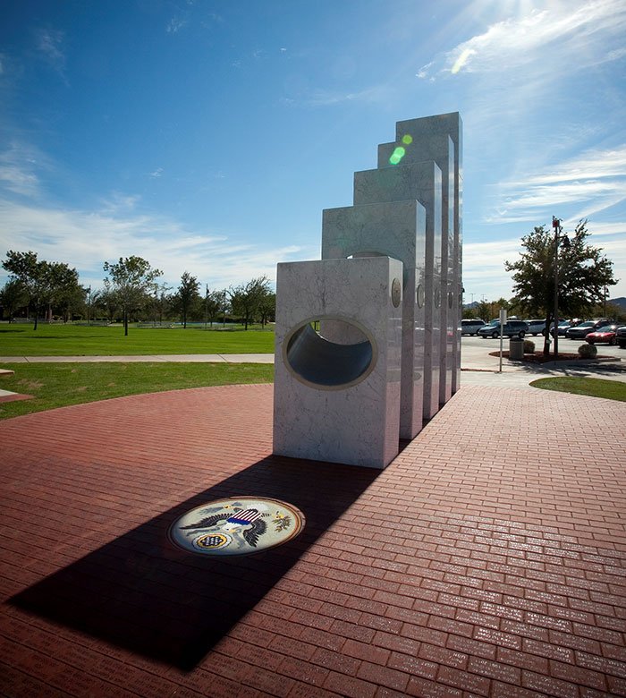 As written by the city’s community council, “At precisely 11:11 a.m. [PT] each Veterans Day (Nov. 11), the sun’s rays pass through the ellipses of the five Armed Services pillars to form a perfect solar spotlight over a mosaic of The Great Seal of the United States,”
