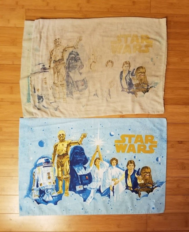 #10 Two of the same pillowcase, but one has been used for 40 years and the other was well-kept.