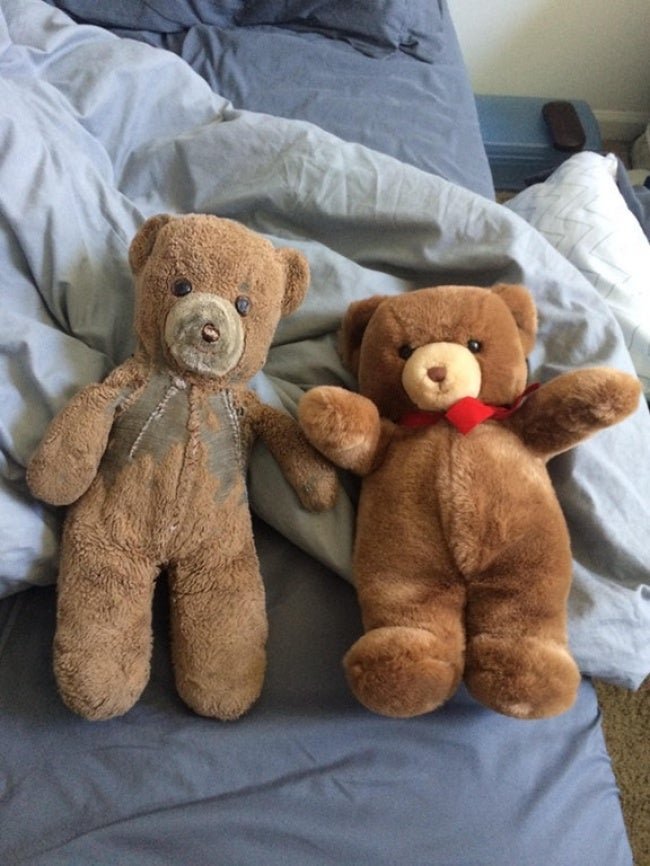 #8 These are two same bears, but the one on the left is 30 years old and the one on the right is brand new for a newborn baby.