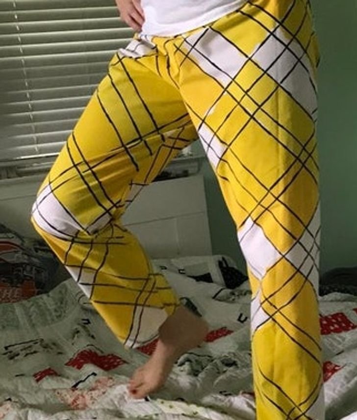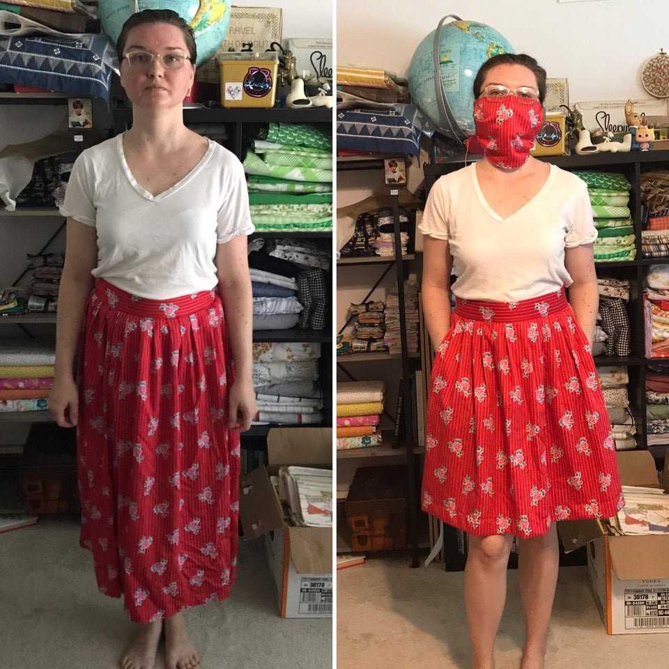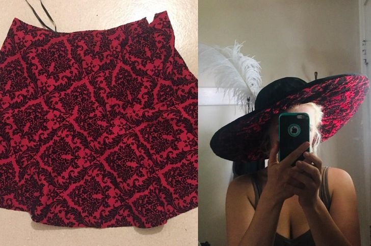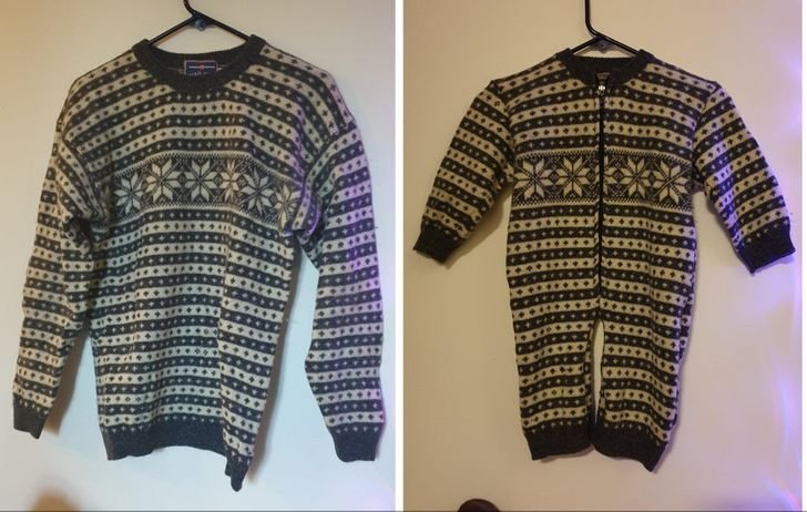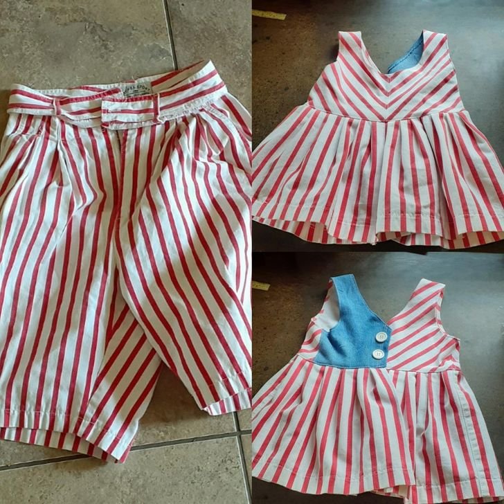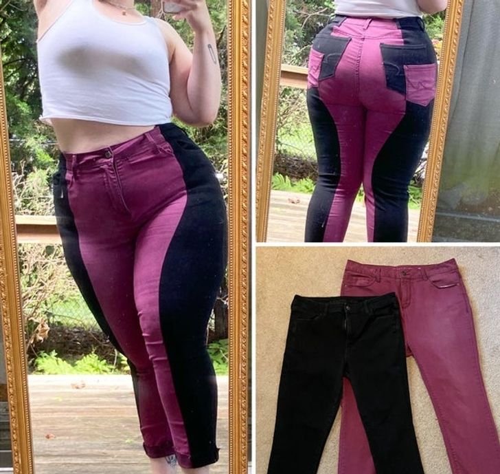 Two-tone pants out of one with busted crotch and another from the thrift store.