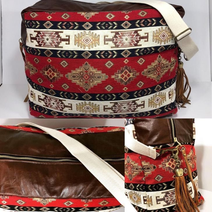 Used Turkish fabric, vintage leather jacket and old purses into a bag.