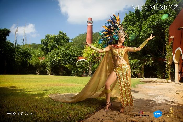 Miss Estado De Mexico's outfit is made with the Aztec inspirations. Preaching about the Santuario Piedra Herrada –, the attire also perfectly portrays the farming of sunflowers.Anna Paulina Rivero As Miss Yucatan