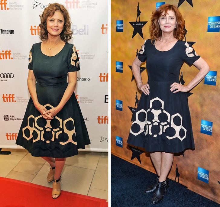 For the premiere of The Last Of Robin Hood, specifically, the second day of the Toronto International Film Festival, Susan arrived in this black dress with a print. Two years later, she repeated the same outfit for the Broadway premiere of the musical Hamilton in New York.Mindy Kaling.