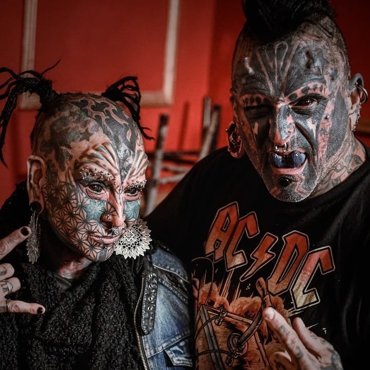 The duo also has body modifications, including 11 subdermal implants, piercings, metal teeth, a split and tattooed tongue, and various scarifications.