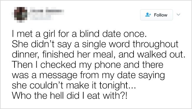 Well, these tweets are not going to make you feel better about your first date tonight, but it will for those of you who had been through those moments. Not all of us had a smooth night and not all of us were good at saying that we don't feel chemistry with our partner that night. But these people took it to another level, did stupid things and some even ended up getting married!